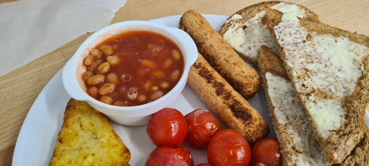 Brecwast llawn wedi'i wneud gyda dewisiadau llysieuol gan gynnwys selsig llysieuol.